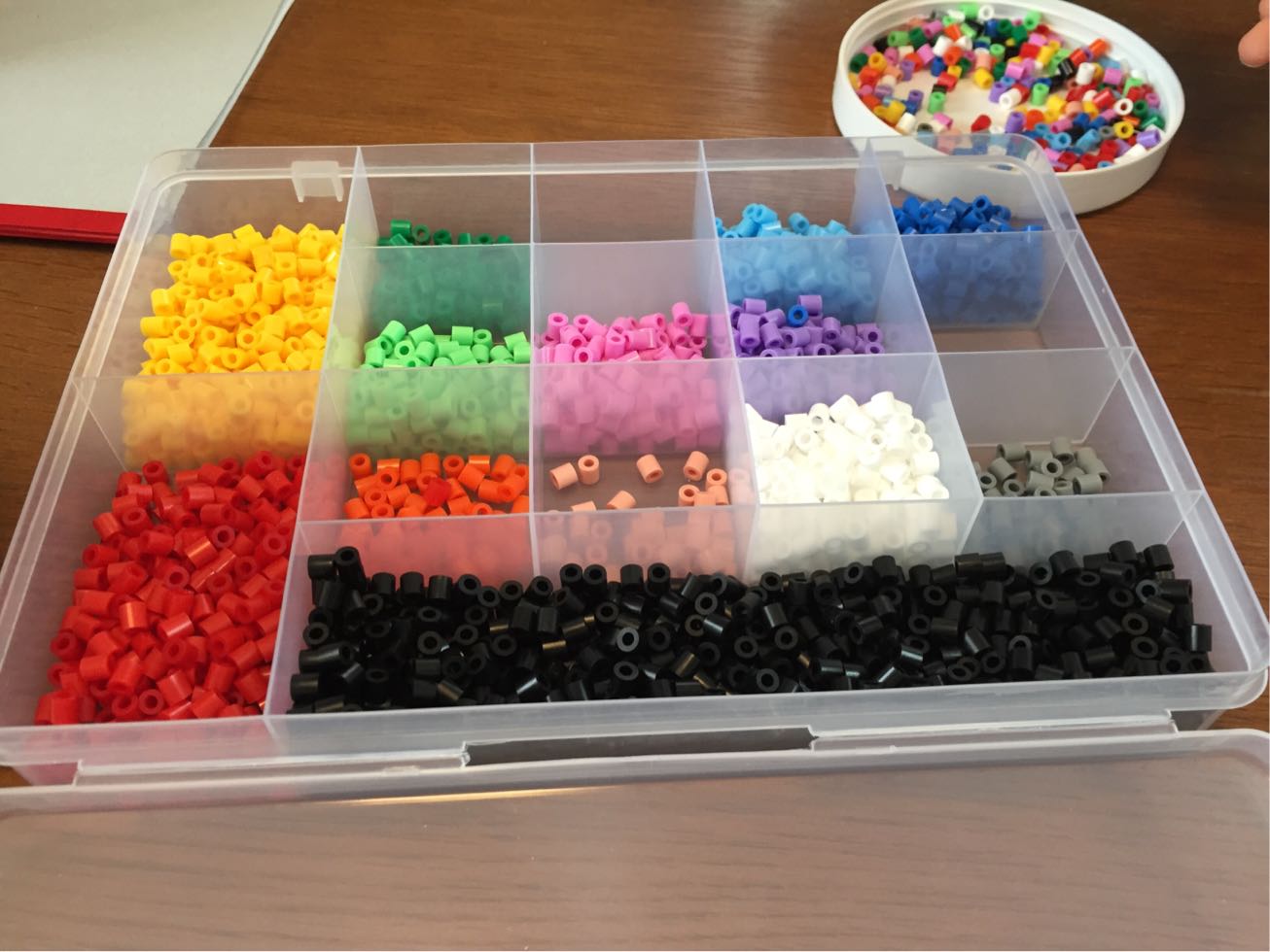 まだ全部分けきって無いのではっきりとは言えませんが、色によってアイロンビーズの量が違うみたいです。