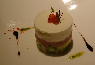アボガド、マグロ、クリームの上にイクラ。
